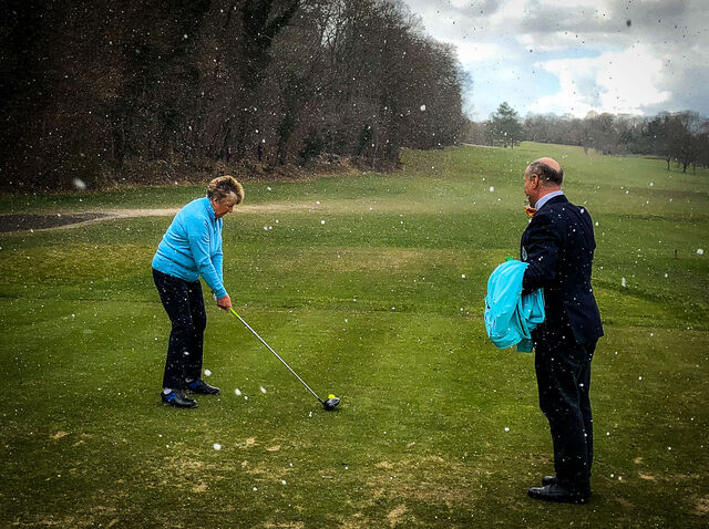Our new Ladies Captain Ann Thomas teeing off in bitter snowy conditions.